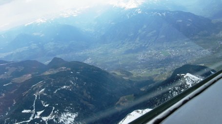 Z editionom je samo še skok do najbolj obdelane evropske doline. Pred nosom je Brixen, z dobro prepoznavnim atletskim stadionom z zelenim tartanom, a najina pot teče tokrat prek Merana. Letiva nad terenom, ki sem ga doslej gledal bolj od daleč, ko pa preskočiva dolino, znano po tem, da spodaj ni niti enega terena za zunajletališki pristanek, se nasloniva na severna pobočja doline Vinschgau. Boštjana nisem niti vprašal, do kje namerava, samo opazujem in se čudim zimi tam spodaj. Letališke steze v Bolzanu, na kateri so že mnogi našli varno zavetje, južno od najine smeri, ni mogoče zgrešiti. Dolina se krepko dviga, na to opozarja železnica, ki se v širokih serpentinah prebija proti zahodu. Sva krepko prek 3000 m nad morjem, in šele doma na OLC ugotovim, kako hitro sva potovala, od 150 do 210 km/h. Nad gorsko pokrajino sem orientacijsko že povsem izgubljen.