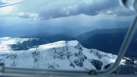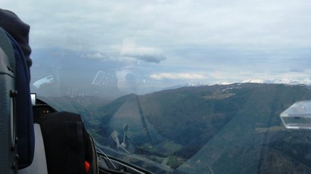 Na višini 1500 m QNH ugasne motor, letalo sledi smeri proti zahodu, v ravnem letu izgubiva kakšnih 250 m, brez znamenj, da bi se v zraku kaj dogajalo. Pred nama se na sivem nebu pokažejo dokaj izraziti sivi kosmi, lahko bi dejal, da so kopasti oblaki v sivočrnih odtenkih na ozadju s sivino prekritega neba. Ugibava kateri od obeh, na robu Menine, je bližje, predvsem pa upava, da imajo povezavo s slabo osvetljenim terenom. Eureka! Že prva sivina zagrabi s kakšna 2 m/sek. Narava torej vendarle deluje, pa čeprav si je nadela pesimistični izraz. Do Krvavca priletiva dovolj visoko, da preletiva smučišče v višini hotela, takoj prelijeva višek hitrosti v višino in nadaljujeva na Huje. Spodaj opazujeva gradbišče nove steze v Lescah. Boštjan pove, da bodo že v naslednjih dnevih začeli polagati asfaltno prevleko, na hitro navrže še nekaj podrobnosti o dogajanjih okoli letališča, in nekaj dni kasneje se pokaže, da postajajo že rahlo neokusna. V rahlem severu se, po nekaj zavojih, premakneva s Karavank pod Julijce, pozdraviva Planico, nato občudujeva s svežim snegom oprhan Špik, v sneg urezano cesto čez Vršič. Ziljska dolina in Dobrač ostajata vse bolj na desni. Zapeljeva čez »slovensko« smučišče na Višarjih, Mokrine so že krepko desno, dolino Zile samo še slutiva tam nekje zadaj. Tu doslej še nisem jadral in prav zato se oziram po oprijemljivih točkah. Na levi spodaj preletiva Pontebo, v podaljšku levega krila pa je že italijanska nižina.