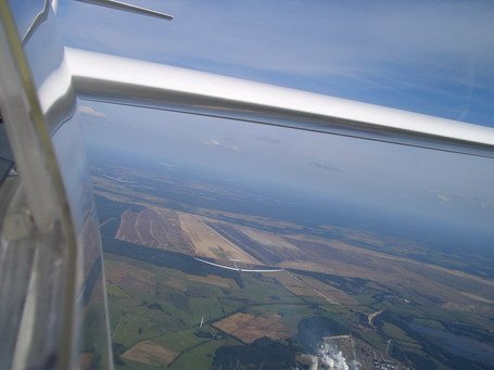 »Naredil sem veliko napako, brez katere bi morda celo izpolnil svoja pričakovanja. Dogajalo se je približno 80 km pred ciljem, v zelo močnem čelnem vetru. Za dolet mi je manjkalo še kakšnih 1000 m. Moral bi preskočiti do naslednje oblačne ceste, ki pa je peljala nekoliko iz zaželene smeri. Če bi se spustil z vetrom, skoraj pravokotno iz prave smeri, do oblačne ceste, in šele nato obrnil proti cilju, bi ravnal pravilno. Najbrž bi prišel domov brez težav. Ampak, to je razmišljanje po bitki. Odločil sem se za krajšo pot, v prepričanju, da bom dosegel področje dviganja. Ciljal sem pod lep črn oblak, napajala ga je velika požeta žitna njiva, poleg pa je bil gozd, šolski primer področja, kjer bi moralo biti dviganje. Zaradi močnega vetra sem prišel pod oblak sto metrov prenizko. Prižgal sem motor, a bi ga po slabi minuti lahko tudi ugasnil. Dviganje 3 m/sek je lepo prijelo, vendar sem bil nekaj metrov prenizek.«