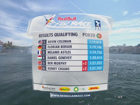 Točke skupnega seštevka po šestih od osmih dirk: 1. Martin Šonka (CZE) 54 točk, 2. Pete McLeod (CAN) 50 točk, 3. Kirby Chambliss (USA) 47 točk, 4. Yoshihide Muroya (JPN) 44 točk, 5. Petr Kopfstein (CZE) 34 točk, 6. Matthias Dolderer (GER) 27 točk, 7. Matt Hall (AUS) 25 točk, 8. Michael Goulian (USA) 24 točk, 9. Juan Velarde (ESP) 21 točk, 10. Mikaël Brageot (FRA) 15 točk, 11. Peter Podlunšek (SLO) 14 točk, 12. Nicolas Ivanoff (FRA) 14 točk, 13. François Le Vot (FRA) 8 točk, 14. Cristian Bolton (CHI) 7 točk