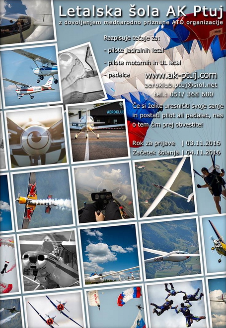 Aeroklub Ptuj v svojo letalsko šolo vabi bodoče pilote jadralnih, motornih in UL letal ter padalce. Na lanski razpis se je prijavilo rekordno število kandidatov, ki letos že samostojno letijo. Si tudi vi želite uresničiti svoje sanje in postati pilot / padalec? Zdaj je pravi čas za prijavo. Sprejemajo jih do 3. 11., s šolanjem pa pričnejo že dan kasneje...