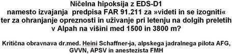 Zamisel ničelne hipoksije še ni kot FLARM stvar splošnega zanimanja vseh pilotov in tudi ni z ničemer izražena v predpisih, čeprav ni niti nova niti neizvedljiva. Vojaški piloti se je poslužujejo že dolgo, avtor pa šele zadnjih 8 let z dosledno uporabo EDS-D1 od vzleta do pristanka. Od prvega preleta v Alpah je njegov osebni vtis takšen: