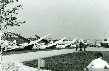 Prispeli smo na ptujsko letališče v Moškanjcih. Na prvi pogled je dobil površen opazovalec vtis, da smo zapeljali na gasilsko veselico. Vse je vpilo, klicalo, smeha in zbadljivk je bilo na škafe. Motorna letala so hrumeč vozila na svoj prostor za nočevanje. Po šotorih in okrog njih so čIani zemeljskih ekip urejali svojo prtljago in pripravljali ležišča za teden dni, katere smo morali preživeti na letališču. Največ se nas je zbralo okoli točilnice. Srečali smo se stari znanci in razpravljali o vsem mogočem, največ pa seveda o bodočem tekmovanju. Preko vseh teh glasov pa je po zvočniku Ivo Robič prepeval svoje obrabljene viže. No, pa tu vendarle ni bila gasilska veselica. Popoldne smo imeli priložnost spoznati, da so marljivi Ptujčani s predsednikom Tramškom in Viharjem na čelu, pripravili vse najboljše za naš telesni in duševni blagor.